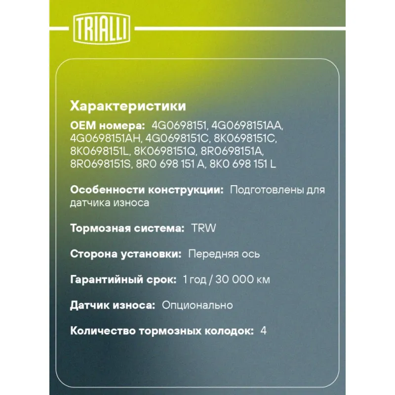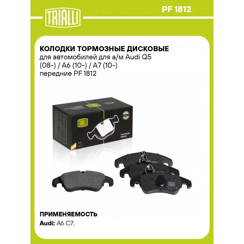 Колодки тормозные дисковые для автомобилей для а/м Audi Q5 (08-) / A6 (10-) / A7 (10-) передние Характеристики: Артикул: PF 1812 OEM номера: 4G0698151, 4G0698151AA, 4G0698151AH, 4G0698151C, 8K0698151C, 8K0698151L, 8K0698151Q, 8R0698151A, 8R0698151S, 8R0 698 151 A, 8K0 698 151 D, 8K0 698 151 E, 8K0 698 151 K, 8R0 698 151, 8K0 698 151, 8K0 698 151 G, 4GD698151, 4G0698151D, 4G0698151L, 4G0698151D, 4G0698151L, 8K0 698 151 L, 8K0 698 151 J, 8K0 698 151 C, 8K0 698 151 B, 4G0 698 151 AA, 8K0 698 151 H, L4GD698151C, 4GD698151B Количество на автомобиль: 1 Сторона установки: передняя ось Особенности конструкции:: Подготовлены для датчика износа Тормозная система: TRW Гарантийный срок: 1 год / 30 000 км Датчик износа: Опционально Количество тормозных колодок: 4 Сопутствующий товар: Диски тормозные: DF 180137 Ширина 1, мм: 188 Ширина 2, мм: 188 Высота 1, мм: 73,1 Высота 2, мм: 73,6 Толщина, мм: 18,2 Материал фрикционной накладки: Low-Metallic Сопутствующий товар: Суппорты тормозные: CF 182553; CF 182554 Подходит для авто: Audi A6 C7 (11-), A6 C7 (11-) Для проверки применяемости отправьте VIN автомобиля через вкладку "Есть вопросы о товаре?" Комплектация: Колодка тормозная - 4 шт Гарантия: от 1 года.