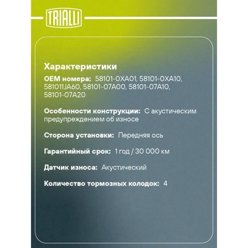 | Гарантийный срок | 1 год / 30 000 км |