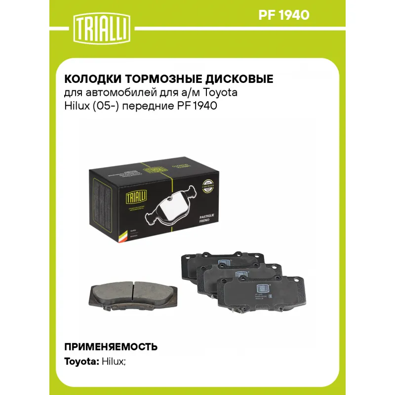 Колодки тормозные дисковые для автомобилей для а/м Toyota Hilux (05-) передние Характеристики: Артикул: PF 1940 OEM номера: 04465-0K330, 04465-0K260, 04465-0K240, 04465YZZEF, 044650K340 Количество на автомобиль: 1 Сторона установки: Передняя ось Особенности конструкции:: С акустическим предупреждением об износе WVA: 5210, 25209 Тормозная система: Advics Гарантийный срок: 1 год / 30 000 км Датчик износа: Акустический Количество тормозных колодок: 4 Сопутствующий товар: Диски тормозные: DF 270066 Ширина, мм: 143,5 Высота, мм: 67,5 Толщина, мм: 17 Материал фрикционной накладки: Low-Metallic Подходит для авто: Toyota Hilux (05-) Для проверки применяемости отправьте VIN автомобиля через вкладку "Есть вопросы о товаре?" Комплектация: Колодка тормозная - 4 шт Гарантия: от 1 года.