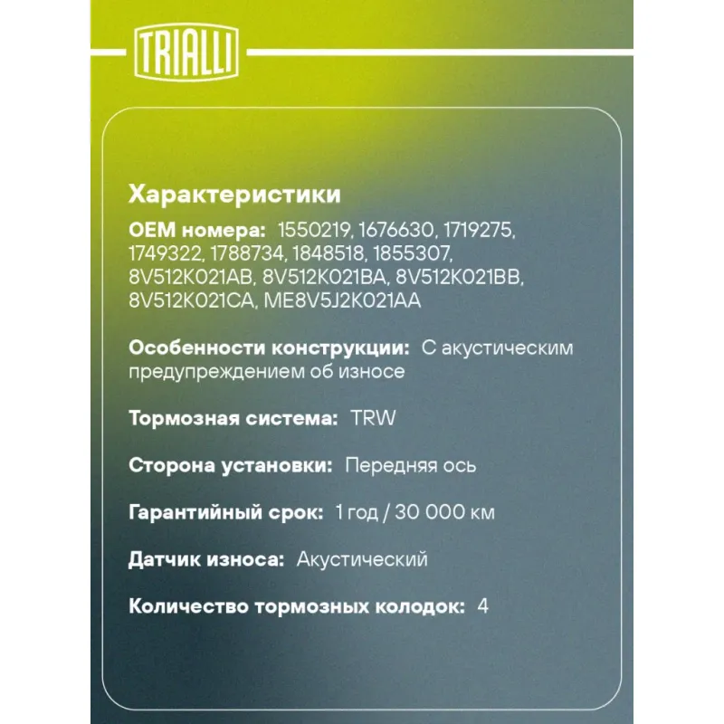 | Гарантийный срок | 1 год / 30 000 км |