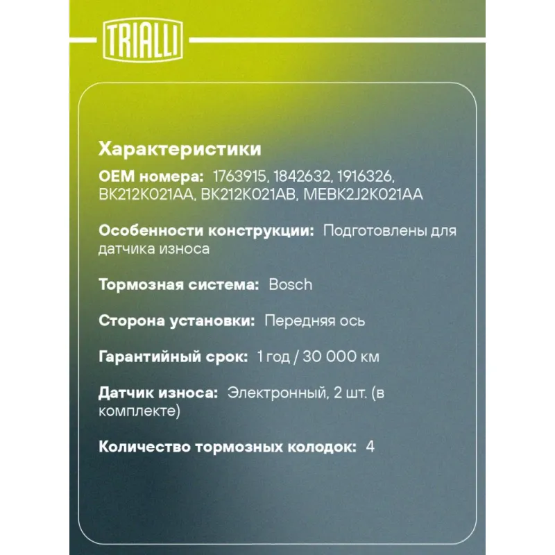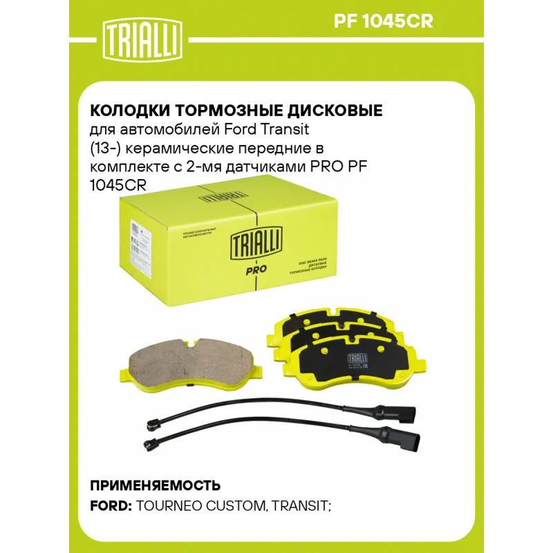 Колодки тормозные дисковые для автомобилей Ford Transit (13-) керамические передние в комплекте с 2-мя датчиками PRO Характеристики: Артикул: PF 1045CR OEM номера: 1763915, 1842632, 1916326, BK212K021AA, BK212K021AB, MEBK2J2K021AA Особенности конструкции:: Подготовлены для датчика износа Гарантийный срок: 1 год / 30 000 км Количество на автомобиль: 1 Сторона установки: Передняя ось WVA: 25602 Тормозная система: Bosch Датчик износа: Электронный, 2 шт. (в комплекте) Количество тормозных колодок: 4 Ширина, мм: 171,8 Высота, мм: 68,8 Толщина, мм: 17 Материал фрикционной накладки: Ceramic Товарная линейка: PRO Комплектация: Датчик износа - 2 шт Колодка тормозная - 4 шт Гарантия: от 1 года.