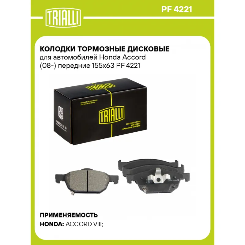 Колодки тормозные дисковые для автомобилей Honda Accord (08-) передние 155x63 Характеристики: Артикул: PF 4221 OEM номера: 45022-TL1-G00, 45022-TL1-G01 Количество на автомобиль: 1 Сторона установки: Передняя ось Особенности конструкции:: С акустическим предупреждением об износе Гарантийный срок: 1 год / 30 000 км Датчик износа: Акустический Количество тормозных колодок: 4 Дополнительная информация: С поршневыми зажимами Ширина, мм: 155.1 Высота 1, мм: 62.5 Высота 2, мм: 55.3 Толщина, мм: 16.5 Комплектация: Колодка тормозная - 4 шт Гарантия: от 1 года.