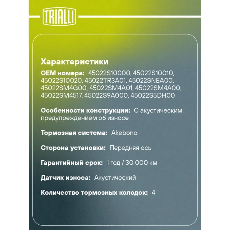 Колодки тормозные дисковые для автомобилей Honda Accord (97-) / Civic VIII (06-) 1.8i передние Характеристики: Артикул: PF 4218 OEM номера: 45022S10000, 45022S10010, 45022S10020, 45022TR3A01, 45022SNEA00, 45022SM4G00, 45022SM4A01, 45022SM4A00, 45022SM4517, 45022S9A000, 45022S5DH00, 45022S5DA00, 45022S01A03, 45022S01A02, 06450S9A010, 06450S9A000, 06450S5DA01, 06450S5DA00 Количество на автомобиль: 1 Сторона установки: Передняя ось Особенности конструкции:: С акустическим предупреждением об износе WVA: 21497, 21498, 21499 Тормозная система: Akebono Гарантийный срок: 1 год / 30 000 км Датчик износа: Акустический Количество тормозных колодок: 4 Сопутствующий товар: Диски тормозные: DF 230101, DF 230104, DF 230102 Ширина, мм: 138 Высота, мм: 52 Толщина, мм: 18 Материал фрикционной накладки: Low-Metallic Подходит для авто: Honda Civic VIII (06-), Civic IX (11-), Accord (97-) Для проверки применяемости отправьте VIN автомобиля через вкладку "Есть вопросы о товаре?" Комплектация: Колодка тормозная - 4 шт Гарантия: от 1 года.