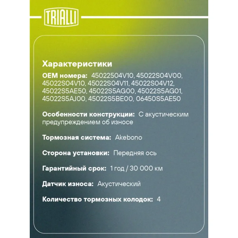 Колодки тормозные дисковые для автомобилей Honda Civic VII (00-) с тормозной системой Akebono передние Характеристики: Артикул: PF 4215 OEM номера: 45022504V10, 45022S04V00, 45022S04V10, 45022S04V11, 45022S04V12, 45022S5AE50, 45022S5AG00, 45022S5AG01, 45022S5AJ00, 45022S5BE00, 06450S5AE50, 06450S5AG00, 06450S5AJ00, 06450S5BJ00, 06450S7AJ00, 45022S04V01, 45022S04V02, 45022S5BJ00, 45022S7A000, 45022SCC000, 45022SO4V10, 45022SO4V11, 45022SO4V12, 45022SR3V00, 45022SR3V01, 45022SR3V02, 45022SR3V03, 45022SR3V10, 45022SR3V11, 45022SR3V12, 45022TR2A00, AY040HN007 Количество на автомобиль: 1 Сторона установки: Передняя ось Особенности конструкции:: С акустическим предупреждением об износе WVA: 21695, 21696, 21694 Тормозная система: Akebono Гарантийный срок: 1 год / 30 000 км Датчик износа: Акустический Количество тормозных колодок: 4 Сопутствующий товар: Диски тормозные: DF 230107 Ширина, мм: 136 Высота, мм: 58 Толщина, мм: 17 Подходит для авто: Honda Civic VI (95-), Civic VII (00-), Civic VII (00-) Для проверки применяемости отправьте VIN автомобиля через вкладку "Есть вопросы о товаре?" Комплектация: Колодка тормозная - 4 шт Гарантия: от 1 года.