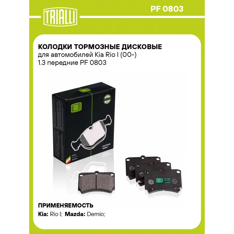 Колодки тормозные дисковые для автомобилей Kia Rio I (00-) 1.3 передние Характеристики: Артикул: PF 0803 OEM номера: K0BA23328Z, 0K30A3328Z, DCY03323Z, DCY03323ZA, DCY03323ZB Количество на автомобиль: 1 Сторона установки: передняя ось Особенности конструкции:: С акустическим предупреждением об износе WVA: 21654, 21655, 21656 Тормозная система: Sumitomo Гарантийный срок: 1 год / 30 000 км Датчик износа: Акустический Количество тормозных колодок: 4 Сопутствующий товар: Диски тормозные: DF 073202 Ширина, мм: 91,6 Высота, мм: 64 Толщина, мм: 15,5 Материал фрикционной накладки: Low-Metallic Подходит для авто: Kia Rio I (00-) Mazda Demio (96-) Для проверки применяемости отправьте VIN автомобиля через вкладку "Есть вопросы о товаре?" Комплектация: Колодка тормозная - 4 шт Гарантия: от 1 года.