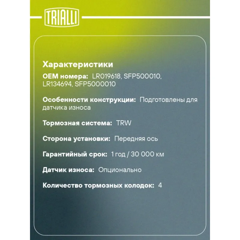 | Особенности конструкции: | Подготовлены для датчика износа |
