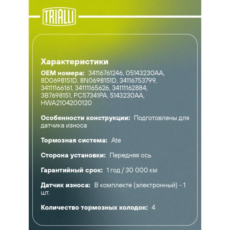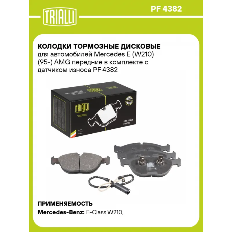 Колодки тормозные дисковые для автомобилей Mercedes E (W210) (95-) AMG передние в комплекте с датчиком износа Характеристики: Артикул: PF 4382 OEM номера: 34116761246, 05143230AA, 8D0698151D, 8N0698151D, 34116753799, 34111166161, 34111165626, 34111162884, 3B7698151, PC57341PA, 5143230AA, HWA2104200120, A0034209120, A0034202120, 0034209120, 0034202120 Количество на автомобиль: 1 Сторона установки: Передняя ось Особенности конструкции:: Подготовлены для датчика износа WVA: 21485, 21484 Тормозная система: Ate Гарантийный срок: 1 год / 30 000 км Датчик износа: В комплекте (электронный) - 1 шт. Количество тормозных колодок: 4 Ширина, мм: 195 Высота, мм: 74 Толщина, мм: 21 Подходит для авто: Mercedes-Benz E-Class W210 (95-), S-Class W220 (98-), S-Class W220 (98-) Для проверки применяемости отправьте VIN автомобиля через вкладку "Есть вопросы о товаре?" Комплектация: Датчик износа - 1 шт Колодка тормозная - 4 шт Гарантия: от 1 года.