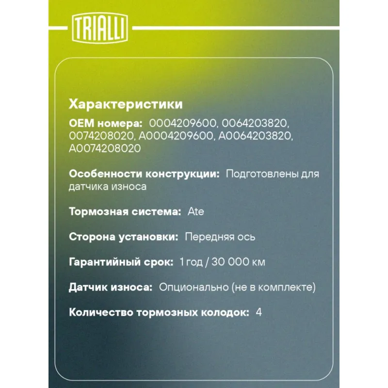 | Датчик износа | Опционально (не в комплекте) |
