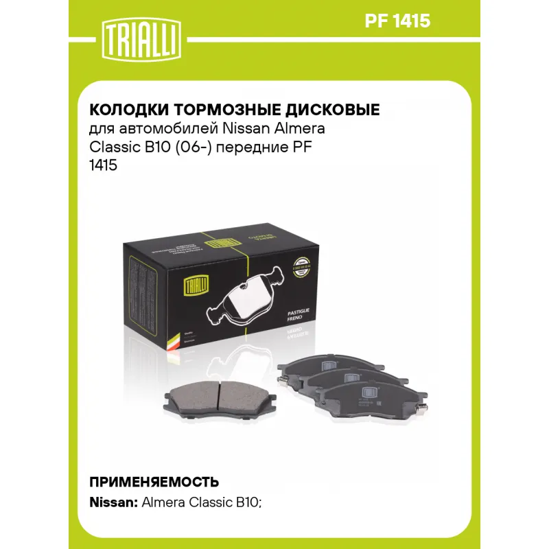 Колодки тормозные дисковые для автомобилей Nissan Almera Classic B10 (06-) передние Характеристики: Артикул: PF 1415 OEM номера: 4106095F0B, 4106095F0A Количество на автомобиль: 1 Сторона установки: передняя ось Особенности конструкции:: С акустическим предупреждением об износе Тормозная система: AKEBONO Гарантийный срок: 1 год / 30 000 км Датчик износа: Акустический Количество тормозных колодок: 4 Сопутствующий товар: Диски тормозные: DF 140105 Ширина, мм: 134,9 Высота, мм: 45,5 Толщина, мм: 15,5 Материал фрикционной накладки: Low-Metallic Подходит для авто: Nissan Almera Classic B10 (06-) Для проверки применяемости отправьте VIN автомобиля через вкладку "Есть вопросы о товаре?" Комплектация: Колодка тормозная - 4 шт Гарантия: от 1 года.