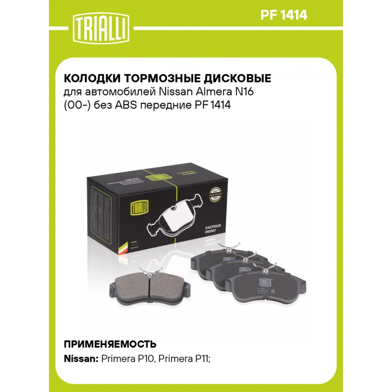 Колодки тормозные дисковые для автомобилей Nissan Almera N16 (00-) без ABS передние PF 1414 TRIALLI