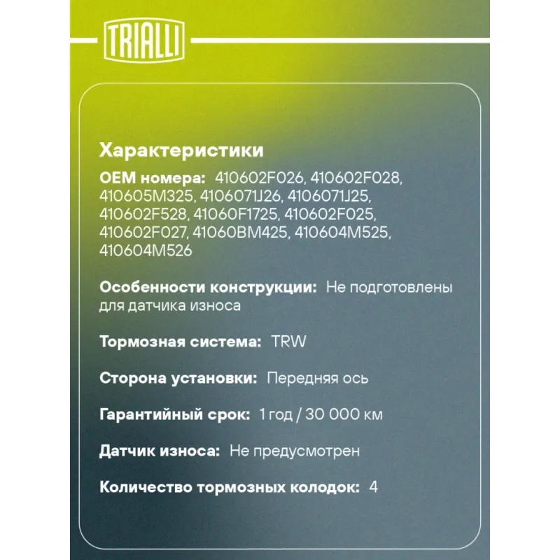 Особенности конструкции: Не подготовлены для датчика износа