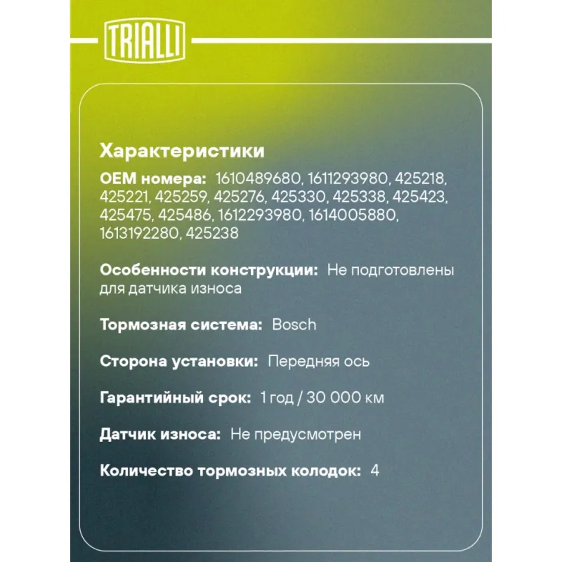 | Особенности конструкции: | Не подготовлены для датчика износа |