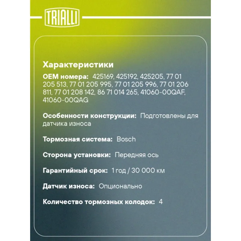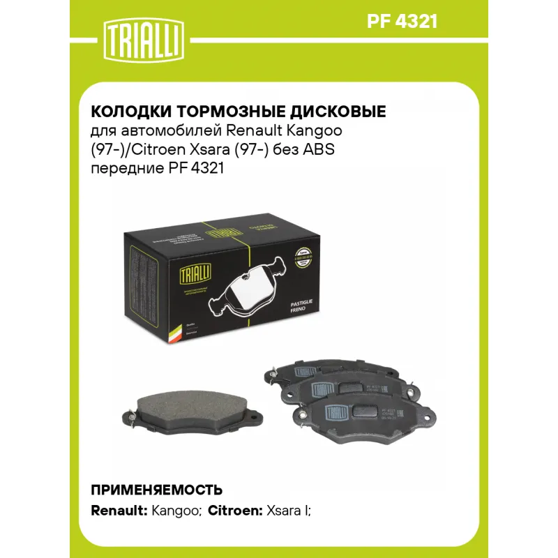 Колодки тормозные дисковые для автомобилей Renault Kangoo (97-)/Citroen Xsara (97-) без ABS передние Характеристики: Артикул: PF 4321 OEM номера: 425169, 425192, 425205, 77 01 205 513, 77 01 205 995, 77 01 205 996, 77 01 206 811, 77 01 208 142, 86 71 014 265, 41060-00QAF, 41060-00QAG Количество на автомобиль: 1 Сторона установки: Передняя ось Особенности конструкции:: Подготовлены для датчика износа WVA: 21980, 21981 Тормозная система: Bosch Гарантийный срок: 1 год / 30 000 км Датчик износа: Опционально Количество тормозных колодок: 4 Сопутствующий товар: Диски тормозные: DF 095104; DF 095105; DF 165101; DF 200101 Ширина, мм: 130,9 Высота, мм: 47,5 Толщина, мм: 17,2 Материал фрикционной накладки: Low-Metallic Подходит для авто: Renault Kangoo (97-), Kangoo (97-) Citroen Xsara I (97-) Для проверки применяемости отправьте VIN автомобиля через вкладку "Есть вопросы о товаре?" Комплектация: Колодка тормозная - 4 шт Гарантия: от 1 года.