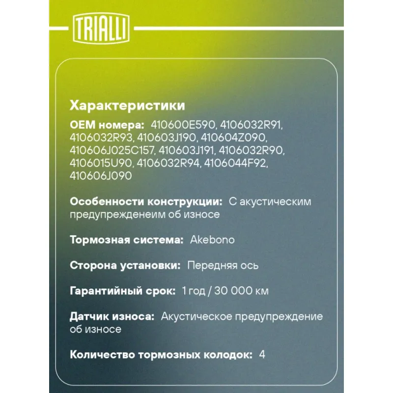 Колодки тормозные дисковые для автомобилей SsangYong Rexton (02-) передние Характеристики: Артикул: PF 4302 OEM номера: 410600E590, 4106032R91, 4106032R93, 410603J190, 410604Z090, 410606J025C157, 410603J191, 4106032R90, 4106015U90, 4106032R94, 4106044F92, 410606J090, 4106065E92, 4106065E91, 4106065E90, 4106064J93, 4106044F91, 4106078E90, 4106076L91, 4106071E92, 4106071E90, 410606T090, 410606J091, 4106079E90, 4106078N91, 4106078N90, 4106078J91, 4106078J90, 4106078E91, 41060G8191, 41060G8190, 410608M190, 4106084L91, 4106084L90, 4106080N90, AY040NS031, AY040NS011, 5810133A00, 41060ZG025, 41060G8193, 41060G8192, AY040NS830, AY040NS804, AY040NS075, AY040NS052, AY040NS047, AY040NS046, D10606J091, AY040NS916, AY040NS915, AY040NS914, AY040NS913, AY040NS839, D106MS2525, D106MG8190, D106M80N90, D106M65E92, D106M65E91, D1060G8190, 4813008000, 4813008050, 4813008150, 4813008151, 4813008152 Количество на автомобиль: 1 Сторона установки: Передняя ось Особенности конструкции:: С акустическим предупрежденеим об износе WVA: 21526, 21527, 21528 Тормозная система: Akebono Гарантийный срок: 1 год / 30 000 км Датчик износа: Акустическое предупреждение об износе Количество тормозных колодок: 4 Сопутствующий товар: Диски тормозные: DF 266018 Ширина, мм: 137 Высота 1, мм: 54,4 Высота 2, мм: 54,6 Толщина, мм: 17 Комплектация: Колодка тормозная - 4 шт Гарантия: от 1 года.