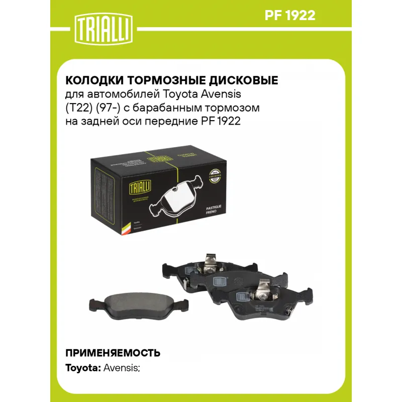 Колодки тормозные дисковые для автомобилей Toyota Avensis (Т22) (97-) с барабанным тормозом на задней оси передние Характеристики: Артикул: PF 1922 OEM номера: 0446505020, 0446505030, 0446505110, 0446505060, 0446505040, 0446505042, 04465YZZCG Количество на автомобиль: 1 Сторона установки: Задняя ось Особенности конструкции:: С акустическим предупреждением об износе WVA: 21976, 21977, 21975 Тормозная система: ATE Гарантийный срок: 1 год / 30 000 км Датчик износа: Акустический Количество тормозных колодок: 4 Ширина, мм: 156,4 Высота, мм: 54,8 Толщина, мм: 18,2 Материал фрикционной накладки: Low-Metallic Подходит для авто: Toyota Avensis (97-), Avensis (97-) Для проверки применяемости отправьте VIN автомобиля через вкладку "Есть вопросы о товаре?" Комплектация: Колодка тормозная - 4 шт Гарантия: от 1 года.
