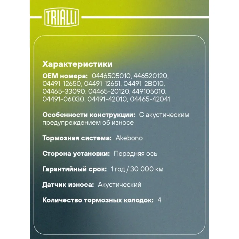 Колодки тормозные дисковые для автомобилей Toyota Corolla (E100) (91-)/Corolla (E110) (97-)/RAV4 (95-) передние Характеристики: Артикул: PF 4343 OEM номера: 0446505010, 446520120, 04491-12650, 04491-12651, 04491-2B010, 04465-33090, 04465-20120, 449105010, 04491-06030, 04491-42010, 04465-42041, 04491-33080, 04491-33010, 04465-12110, 04491-02030, 04465-42040, 04491-12640 Количество на автомобиль: 1 Сторона установки: Передняя ось Особенности конструкции:: С акустическим предупреждением об износе WVA: 21601, 21602, 21603 Тормозная система: Akebono Гарантийный срок: 1 год / 30 000 км Датчик износа: Акустический Количество тормозных колодок: 4 Сопутствующий товар: Диски тормозные: DF 190103; DF 190320; DF 190322 Ширина, мм: 133,2 Высота, мм: 53 Толщина, мм: 17,5 Подходит для авто: Toyota Carina E (92-), Carina VI T190 (92-), Corolla E100 (91-), Corolla E110 (95-), Corolla E110 (95-), RAV 4 (94-), Carina E (92-), Corolla E100 (91-) Для проверки применяемости отправьте VIN автомобиля через вкладку "Есть вопросы о товаре?" Комплектация: Колодка тормозная - 4 шт Гарантия: от 1 года.