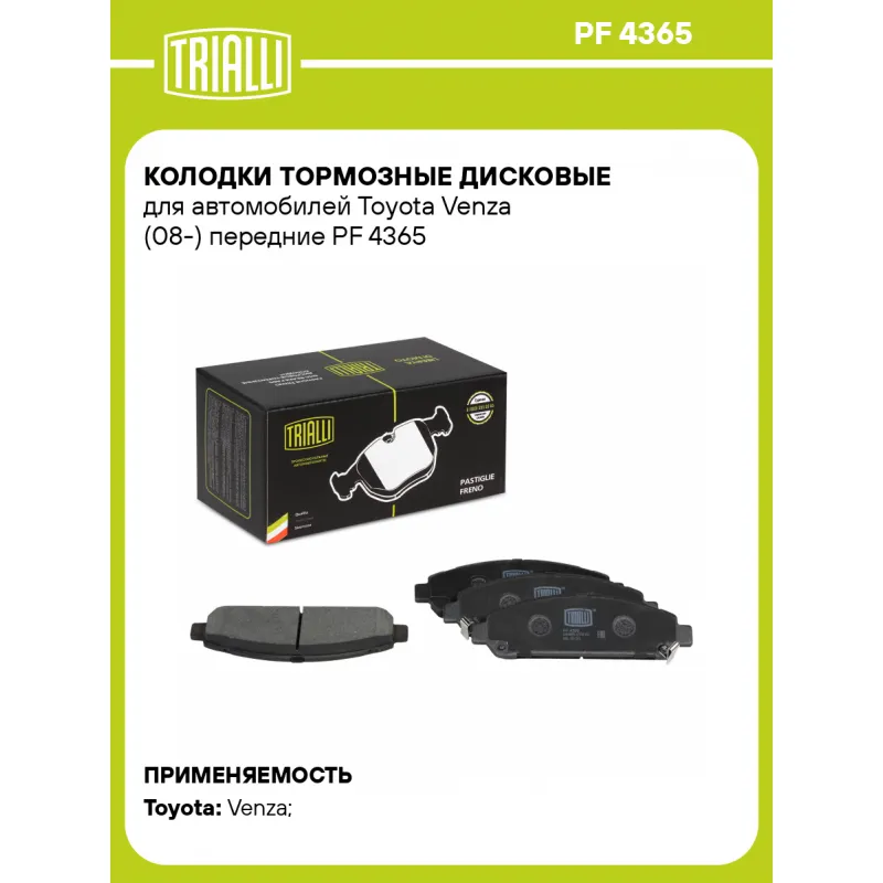 Колодки тормозные дисковые для автомобилей Toyota Venza (08-) передние Характеристики: Артикул: PF 4365 OEM номера: 04465-0T010 Количество на автомобиль: 1 Сторона установки: Передняя ось Особенности конструкции:: С акустическим предупреждением об износе WVA: 25999 Тормозная система: ADVICS Гарантийный срок: 1 год / 30 000 км Датчик износа: Акустический Количество тормозных колодок: 4 Сопутствующий товар: Диски тормозные: DF 084116 Ширина, мм: 167,6 Высота, мм: 53,4 Толщина, мм: 17 Материал фрикционной накладки: Low-Metallic Подходит для авто: Toyota Venza (09-) Для проверки применяемости отправьте VIN автомобиля через вкладку "Есть вопросы о товаре?" Комплектация: Колодка тормозная - 4 шт Гарантия: от 1 года.