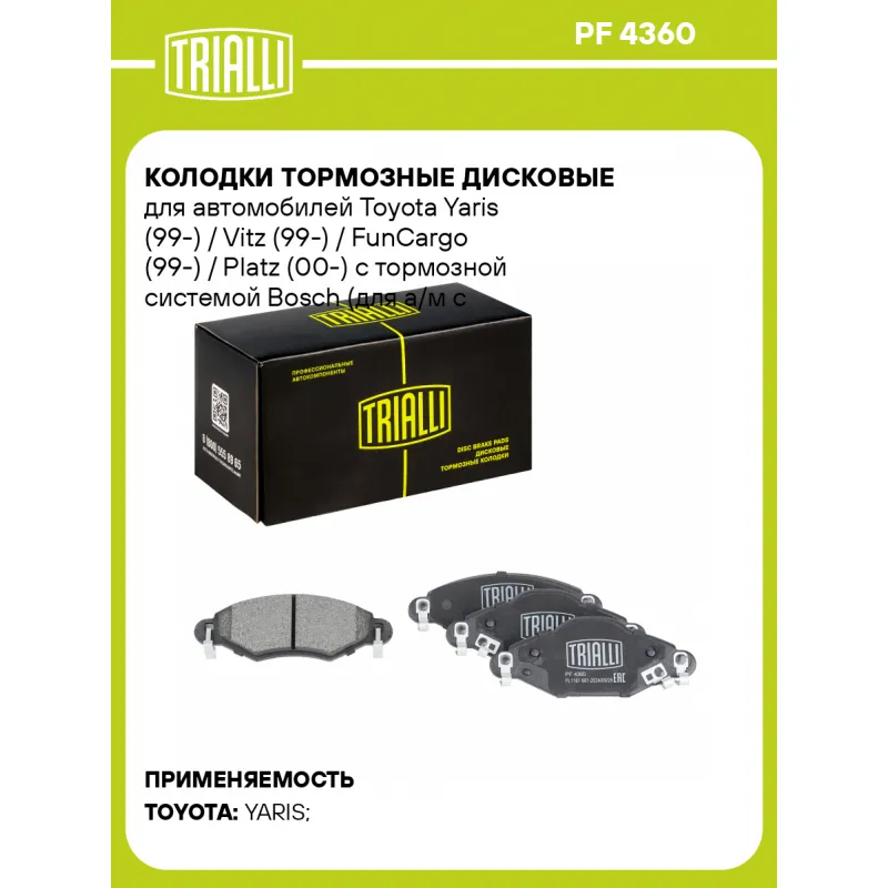 Колодки тормозные дисковые для автомобилей Toyota Yaris (99-) / Vitz (99-) / FunCargo (99-) / Platz (00-) с тормозной системой Bosch (для а/м с барабанным тормозом на задней оси) передние Характеристики: Артикул: PF 4360 OEM номера: 04465-0D010, 04465-0D040, 04465YZZCR, 04465YZZCRA, 04465YZZEM Количество на автомобиль: 1 Сторона установки: Передняя ось Особенности конструкции:: С акустическим предупреждением об износе Гарантийный срок: 1 год / 30 000 км Датчик износа: Акустический Количество тормозных колодок: 4 Ширина, мм: 131 Высота 1, мм: 51.5 Высота 2, мм: 45 Толщина, мм: 16 Комплектация: Колодка тормозная - 4 шт Гарантия: от 1 года.