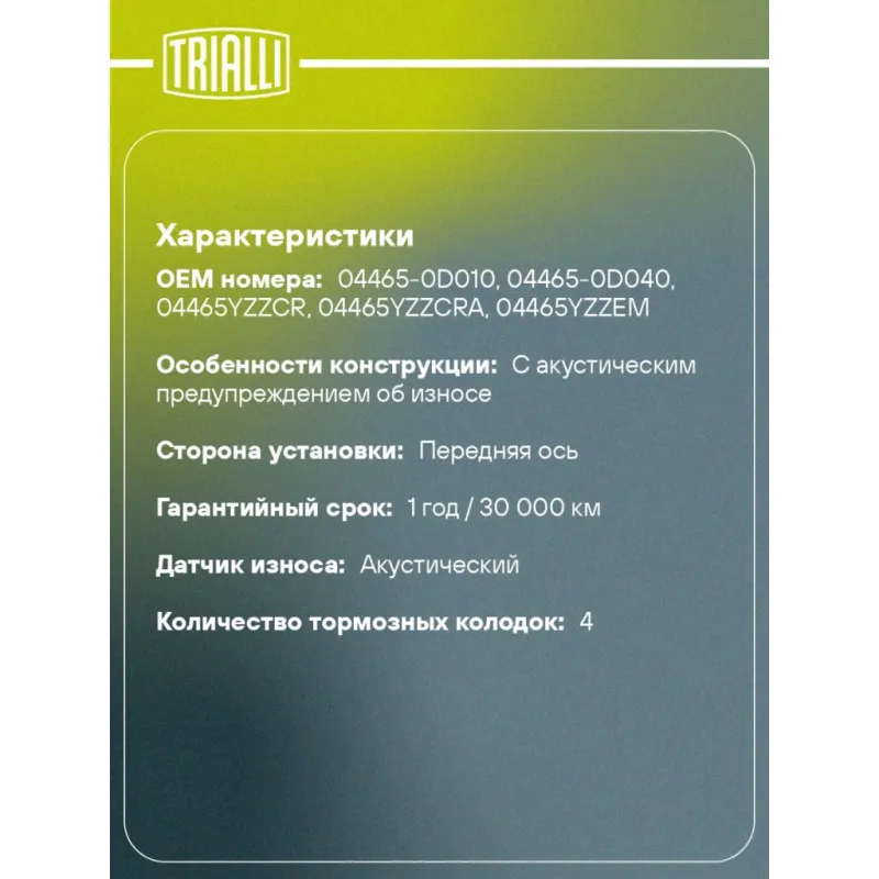 | Гарантийный срок | 1 год / 30 000 км |