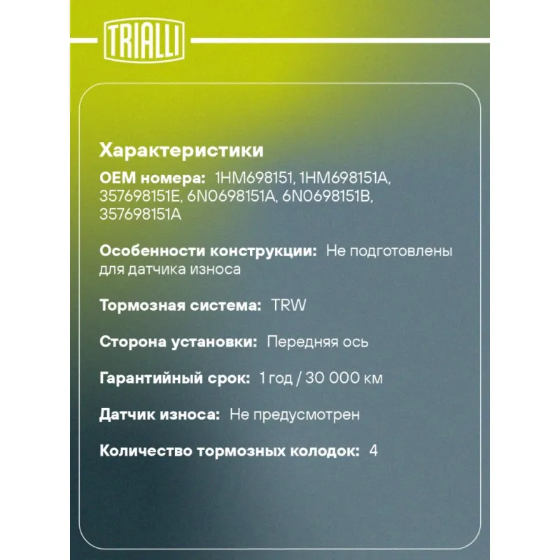 Колодки тормозные дисковые передние для автомобилей VW Golf III (91-) / Polo (94-) / Lupo (98-) / Vento (91-) / Caddy (96-) c тормозной системой TRW Характеристики: Артикул: PF 4376 OEM номера: 1HM698151, 1HM698151A, 357698151E, 6N0698151A, 6N0698151B, 357698151A Количество на автомобиль: 1 Сторона установки: Передняя ось Особенности конструкции:: Не подготовлены для датчика износа WVA: 21945 Тормозная система: TRW Гарантийный срок: 1 год / 30 000 км Датчик износа: Не предусмотрен Количество тормозных колодок: 4 Ширина, мм: 119 Высота, мм: 70 Толщина, мм: 16 Подходит для авто: Volkswagen Caddy (96-), Golf III (91-), Polo III (94-), Lupo (98-), Vento (92-) Для проверки применяемости отправьте VIN автомобиля через вкладку "Есть вопросы о товаре?" Комплектация: Колодка тормозная - 4 шт Гарантия: от 1 года.