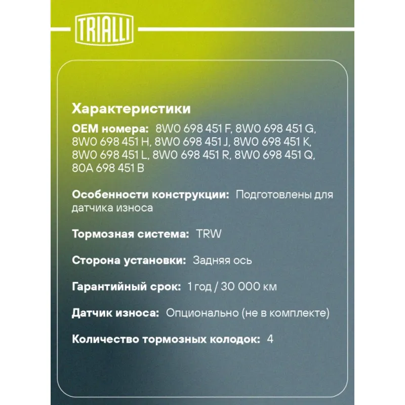 | Датчик износа | Опционально (не в комплекте) |