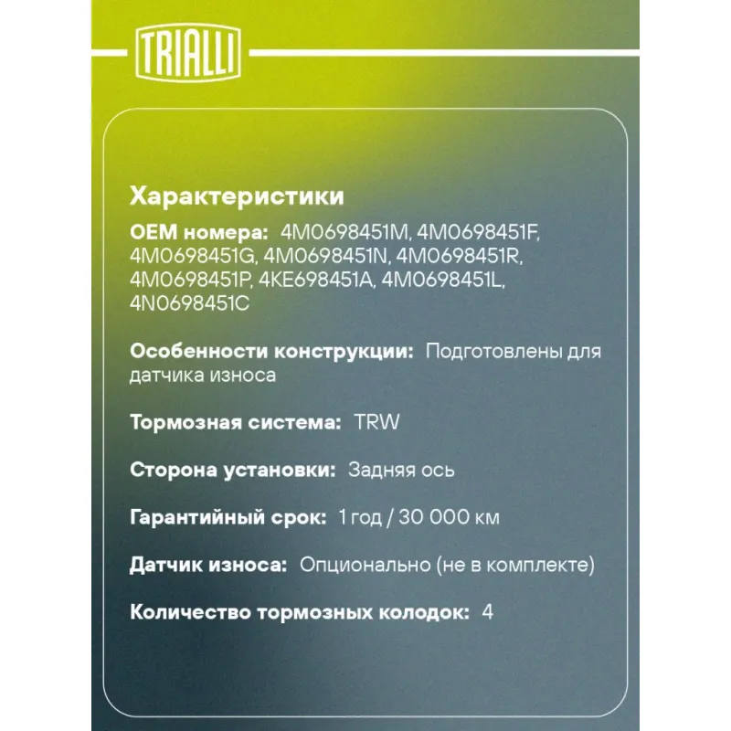 Колодки тормозные дисковые для автомобилей Audi Q7 (15-) / Q8 (18-) / VW Touareg (18-) задние 129x65мм PF 4476 TRIALLI