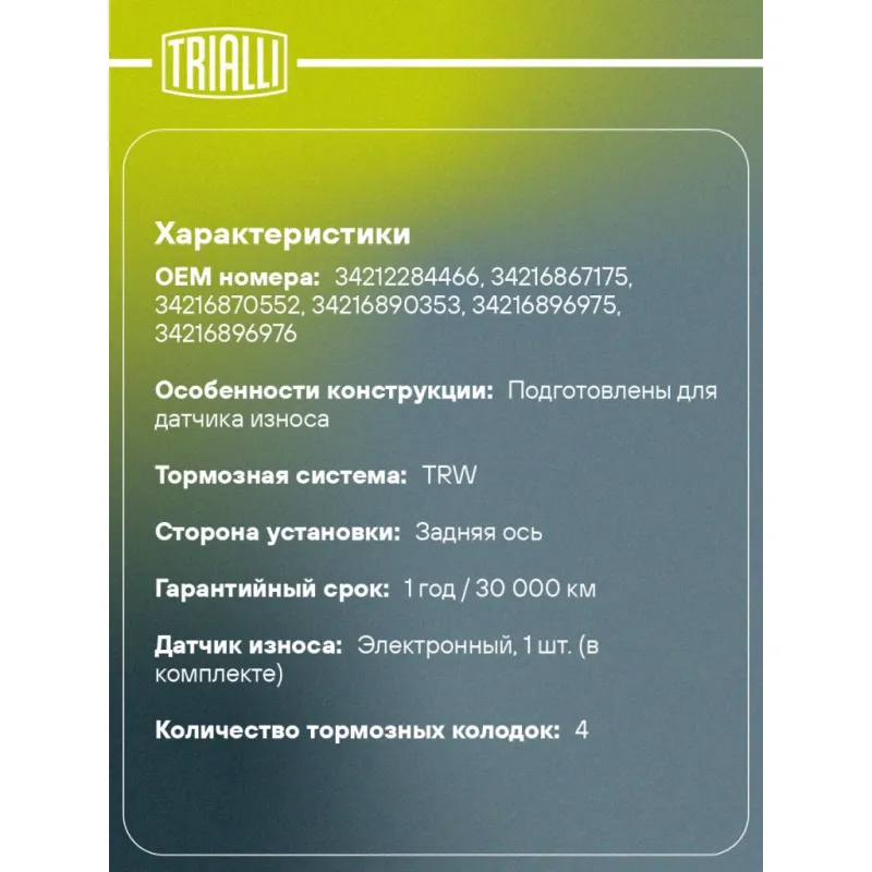 Колодки тормозные дисковые задние керамические для автомобилей BMW 5 (G30) (16-) / 7 (G11) (15-) в комплекте с датчиком [серия PRO] Характеристики: Артикул: PF 4240CR OEM номера: 34212284466, 34216867175, 34216870552, 34216890353, 34216896975, 34216896976 Особенности конструкции:: Подготовлены для датчика износа Гарантийный срок: 1 год / 30 000 км Количество на автомобиль: 1 Сторона установки: Задняя ось WVA: 24704, 25636 Тормозная система: TRW Датчик износа: Электронный, 1 шт. (в комплекте) Количество тормозных колодок: 4 Ширина, мм: 116 Высота, мм: 73 Толщина, мм: 18 Материал фрикционной накладки: Ceramic Товарная линейка: PRO Комплектация: Датчик износа - 1 шт Колодка тормозная - 4 шт Гарантия: от 1 года.