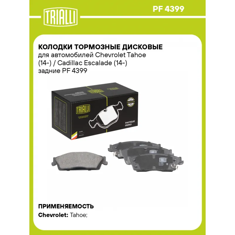 Колодки тормозные дисковые для автомобилей Chevrolet Tahoe (14-) / Cadillac Escalade (14-) задние Характеристики: Артикул: PF 4399 OEM номера: 23135903, 23164777, 84176464 Количество на автомобиль: 1 Сторона установки: Задняя ось Особенности конструкции:: С акустическим предупреждением об износе Датчик износа: Акустический Количество тормозных колодок: 4 Ширина, мм: 143 Высота, мм: 45,5 Толщина, мм: 17 Подходит для авто: Chevrolet Tahoe (14-) Для проверки применяемости отправьте VIN автомобиля через вкладку "Есть вопросы о товаре?" Комплектация: Колодка тормозная - 4 шт Гарантия: от 1 года.
