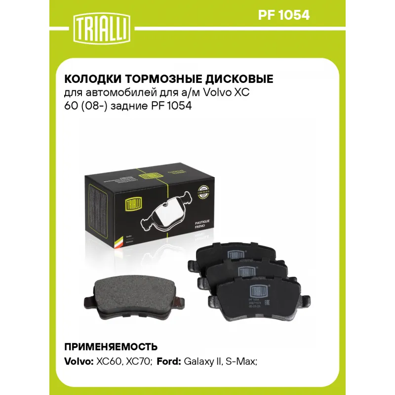 Колодки тормозные дисковые для автомобилей для а/м Volvo XC 60 (08-) задние Характеристики: Артикул: PF 1054 OEM номера: 1503969, 1426144, 1439866, 1459450, 6G91-2M008-FC, 1752093, 6G91-2M008-FD, 1566233, 30671575, 30794555, 30742516, 31317482, 30671574, 31445796, 31408670, 314086700, 31445796, 32300257, 32300257, 30671574, 306715740, 306715750, 30742491, 30794554, LR027129, LR043714, LR027129, LR043714 Количество на автомобиль: 1 Сторона установки: Задняя ось Особенности конструкции:: Не подготовлены для датчика износа Тормозная система: TRW Гарантийный срок: 1 год / 30 000 км Датчик износа: Не предусмотрен Количество тормозных колодок: 4 Сопутствующий товар: Диски тормозные: DF 106116 Ширина, мм: 106,2 Высота, мм: 48,4 Толщина, мм: 16 Материал фрикционной накладки: Low-Metallic Сопутствующий товар: Суппорты тормозные: CF 182069 Подходит для авто: Volvo XC60 (07-), XC60 (07-), XC70 (07-) Ford Galaxy II (06-), S-Max (06-), Galaxy II (06-), Galaxy II (06-), S-Max (06-), S-Max (06-) Для проверки применяемости отправьте VIN автомобиля через вкладку "Есть вопросы о товаре?" Комплектация: Колодка тормозная - 4 шт Гарантия: от 1 года.