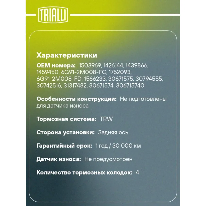 | Особенности конструкции: | Не подготовлены для датчика износа |