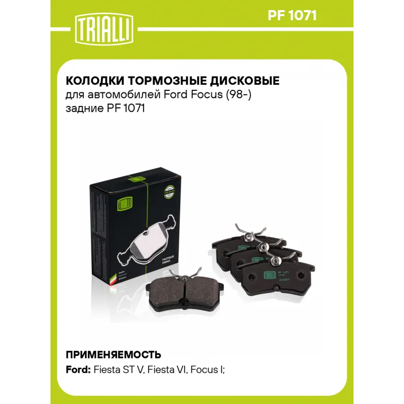 Колодки тормозные дисковые для автомобилей Ford Focus (98-) задние Характеристики: Артикул: PF 1071 OEM номера: 1075565, 1107698, 1425407, 1780884, 1802317, 1810990, C1BC-2M008-AA, C1BC-2M008-AB, C1BC-2M008-AC, 98AB2M008BA, 98AX2M008BA, 98AX2M008BB, 1S4Z2200BA Количество на автомобиль: 1 Сторона установки: задняя ось Особенности конструкции:: Не подготовлены для датчика износа Тормозная система: TRW Гарантийный срок: 1 год / 30 000 км Датчик износа: Не предусмотрен Количество тормозных колодок: 4 Сопутствующий товар: Диски тормозные: DF 106107 Ширина, мм: 87,2 Высота, мм: 42,5 Толщина, мм: 14,5 Материал фрикционной накладки: Low-Metallic Сопутствующий товар: Суппорты тормозные: CF 102001; CF 102002; CF 102061; CF 102062 Подходит для авто: Ford Fiesta ST V (04-), Fiesta VI (08-), Focus I (98-) Для проверки применяемости отправьте VIN автомобиля через вкладку "Есть вопросы о товаре?" Комплектация: Колодка тормозная - 4 шт Гарантия: от 1 года.