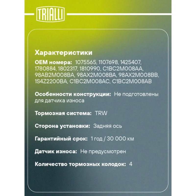 | Особенности конструкции: | Не подготовлены для датчика износа |