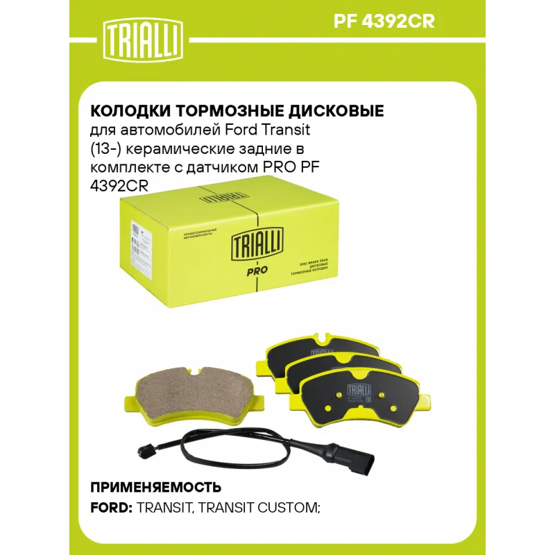 Колодки тормозные дисковые для автомобилей Ford Transit (13-) керамические задние в комплекте с датчиком PRO Характеристики: Артикул: PF 4392CR OEM номера: 1763916, 1829395, 1840037, 1916327, BK212M008AA, BK212M008AB, BK212M008AC, MEBK2J2M008AA Особенности конструкции:: Подготовлены для датчика износа Гарантийный срок: 1 год / 30 000 км Количество на автомобиль: 1 Сторона установки: Задняя ось WVA: 25603, 25604 Тормозная система: TRW Датчик износа: Электронный, 1 шт. (в комплекте) Количество тормозных колодок: 4 Ширина, мм: 137 Высота, мм: 57 Толщина, мм: 19 Материал фрикционной накладки: Ceramic Товарная линейка: PRO Комплектация: Датчик износа - 1 шт Колодка тормозная - 4 шт Гарантия: от 1 года.