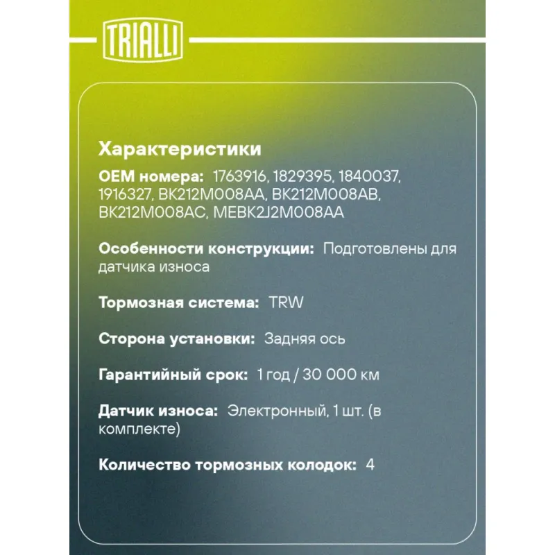 | Особенности конструкции: | Подготовлены для датчика износа |