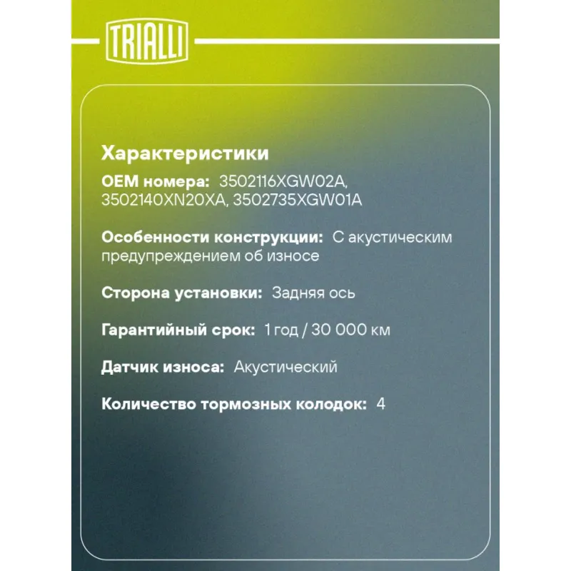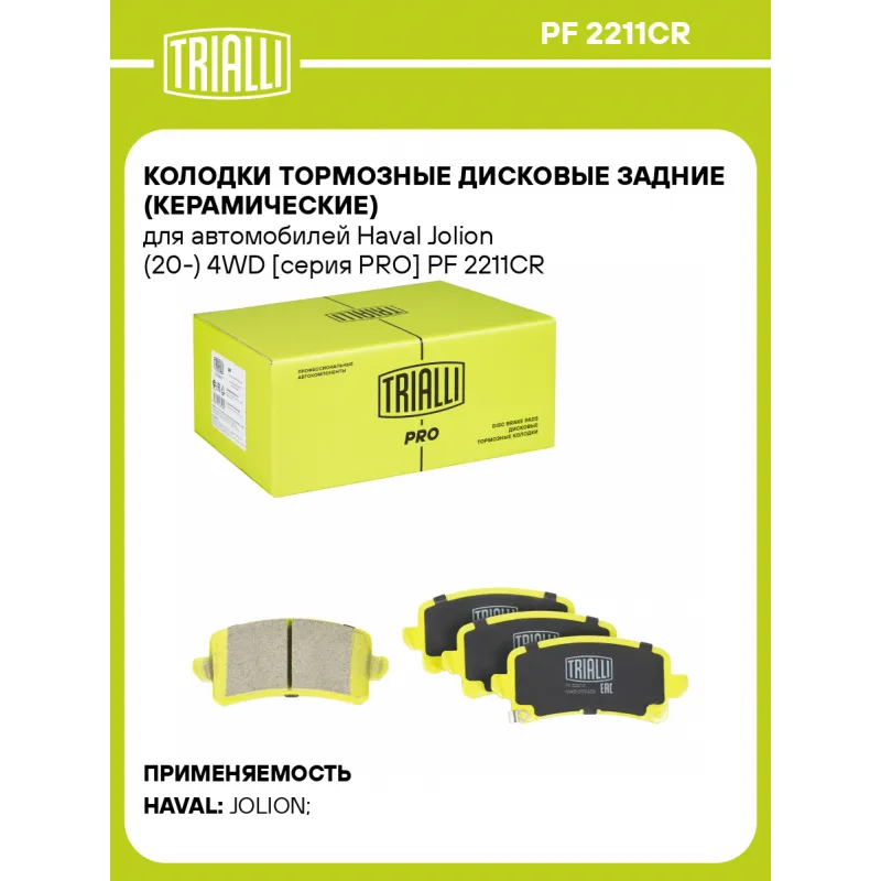 Колодки тормозные дисковые задние (керамические) для автомобилей Haval Jolion (20-) 4WD [серия PRO] Характеристики: Артикул: PF 2211CR OEM номера: 3502116XGW02A, 3502140XN20XA, 3502735XGW01A Особенности конструкции:: С акустическим предупреждением об износе Гарантийный срок: 1 год / 30 000 км Количество на автомобиль: 1 Сторона установки: Задняя ось Датчик износа: Акустический Количество тормозных колодок: 4 Ширина, мм: 105.3 Высота 1, мм: 48.8 Высота 2, мм: 47.7 Толщина, мм: 16 Комплектация: Колодка тормозная - 4 шт Гарантия: от 1 года.