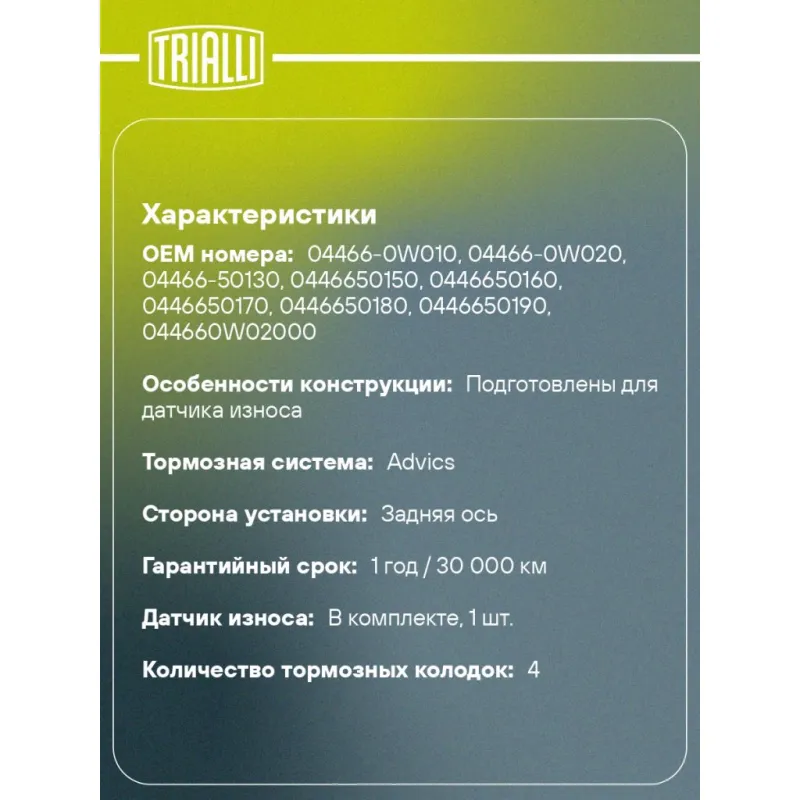 Колодки тормозные дисковые для автомобилей Lexus LS (06-) задние в комплекте с датчиком износа Характеристики: Артикул: PF 4119 OEM номера: 04466-0W010, 04466-0W020, 04466-50130, 0446650150, 0446650160, 0446650170, 0446650180, 0446650190, 044660W02000 Количество на автомобиль: 1 Сторона установки: Задняя ось Особенности конструкции:: Подготовлены для датчика износа WVA: 24244 Тормозная система: Advics Гарантийный срок: 1 год / 30 000 км Датчик износа: В комплекте, 1 шт. Количество тормозных колодок: 4 Ширина, мм: 75 Высота, мм: 77 Толщина, мм: 19 Подходит для авто: Lexus LS 460 (06-) Для проверки применяемости отправьте VIN автомобиля через вкладку "Есть вопросы о товаре?" Комплектация: Датчик износа - 1 шт Колодка тормозная - 4 шт Гарантия: от 1 года.