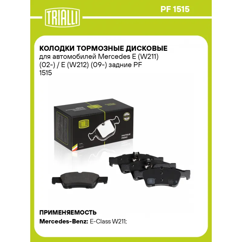 Колодки тормозные дисковые для автомобилей Mercedes E (W211) (02-) / E (W212) (09-) задние Характеристики: Артикул: PF 1515 OEM номера: 007 420 67 20, 007 420 10 20, 007 420 68 20, A0004230230, A0034205120, A0044204420, 0004230230, 0054209320, 0054209420, 0054207920, A0074206720, A0074206820, A4420442067, 0064200120, 0044204420, 0034205120, A004420442067, A0054207920, A0054209320, A0054209420, A0064200120, A0074201020 Количество на автомобиль: 1 Сторона установки: задняя ось Особенности конструкции:: Подготовлены для датчика износа Гарантийный срок: 1 год / 30 000 км Датчик износа: Опционально Количество тормозных колодок: 4 Сопутствующий товар: Диски тормозные: DF 150106 Ширина 1, мм: 141,5 Ширина 2, мм: 140,5 Высота 1, мм: 59,6 Высота 2, мм: 57,4 Толщина, мм: 15,7 Материал фрикционной накладки: Low-Metallic Подходит для авто: Mercedes-Benz E-Class W211 (02-), E-Class W211 (02-) Для проверки применяемости отправьте VIN автомобиля через вкладку "Есть вопросы о товаре?" Комплектация: Колодка тормозная - 4 шт Гарантия: от 1 года.