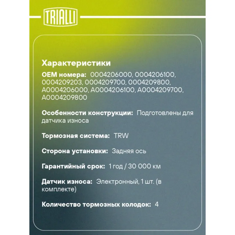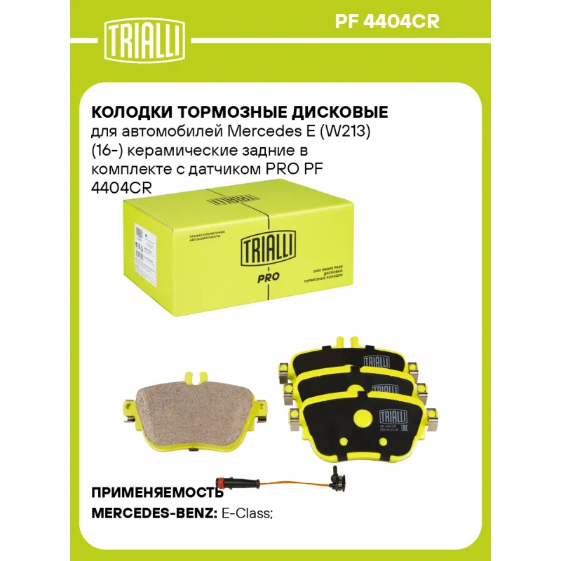 Колодки тормозные дисковые для автомобилей Mercedes E (W213) (16-) керамические задние в комплекте с датчиком PRO Характеристики: Артикул: PF 4404CR OEM номера: 0004206000, 0004206100, 0004209203, 0004209700, 0004209800, A0004206000, A0004206100, A0004209700, A0004209800 Особенности конструкции:: Подготовлены для датчика износа Гарантийный срок: 1 год / 30 000 км Количество на автомобиль: 1 Сторона установки: Задняя ось WVA: 22437, 22438 Тормозная система: TRW Датчик износа: Электронный, 1 шт. (в комплекте) Количество тормозных колодок: 4 Ширина, мм: 114 Высота 1, мм: 55 Высота 2, мм: 64 Толщина, мм: 16 Материал фрикционной накладки: Ceramic Товарная линейка: PRO Комплектация: Датчик износа - 1 шт Колодка тормозная - 4 шт Гарантия: от 1 года.