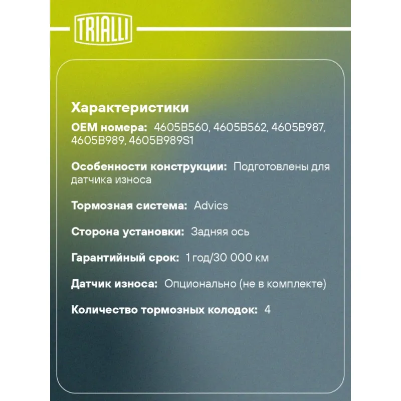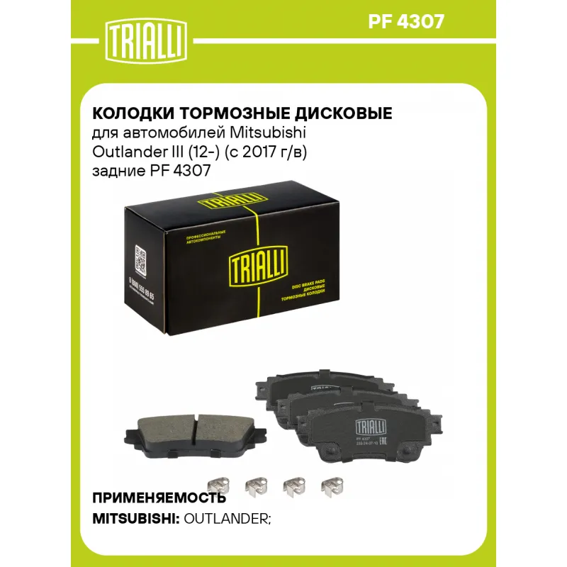 Колодки тормозные дисковые для автомобилей Mitsubishi Outlander III (12-) (с 2017 г/в) задние Характеристики: Артикул: PF 4307 OEM номера: 4605B560, 4605B562, 4605B987, 4605B989, 4605B989S1 Количество на автомобиль: 1 Сторона установки: Задняя ось Особенности конструкции:: Подготовлены для датчика износа WVA: 22864 Тормозная система: Advics Датчик износа: Опционально (не в комплекте) Количество тормозных колодок: 4 Ширина, мм: 104 Высота, мм: 42 Толщина, мм: 14 Комплектация: Колодка тормозная - 4 шт Гарантия: от 1 года.