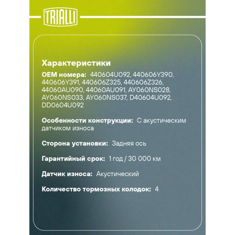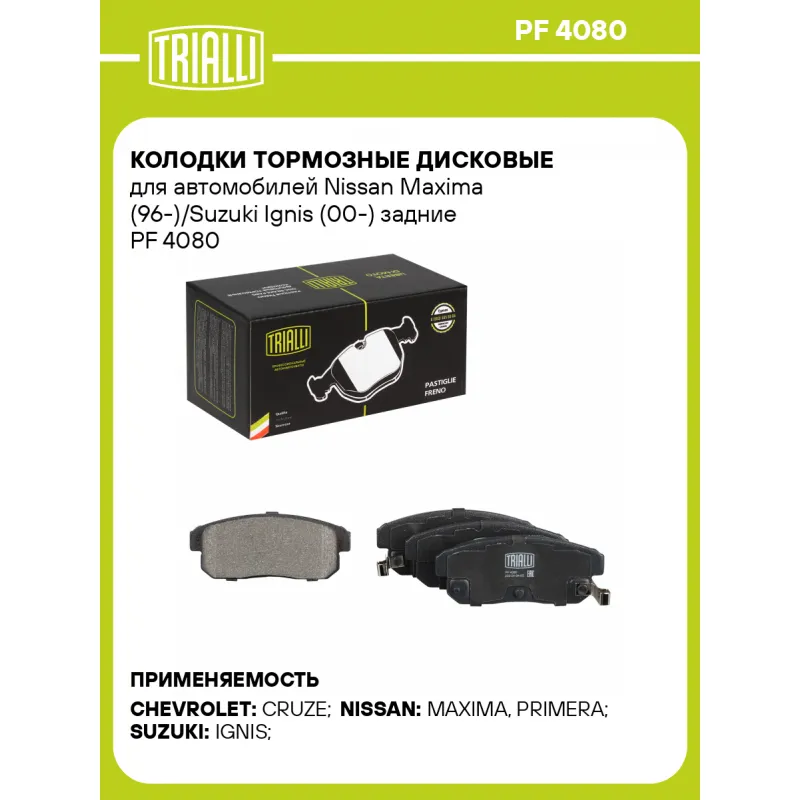 Колодки тормозные дисковые для автомобилей Nissan Maxima (96-)/Suzuki Ignis (00-) задние Характеристики: Артикул: PF 4080 OEM номера: 440604U092, 440606Y390, 440606Y391, 440606Z325, 440606Z326, 44060AU090, 44060AU091, AY060NS028, AY060NS033, AY060NS037, D40604U092, DD0604U092, 5580060J00, 5580060J00000, 5580060J10, 5580060J10000 Количество на автомобиль: 1 Сторона установки: Задняя ось Особенности конструкции:: С акустическим датчиком износа WVA: 24040, 24041, 24039 Гарантийный срок: 1 год / 30 000 км Датчик износа: Акустический Количество тормозных колодок: 4 Ширина, мм: 105,5 Высота, мм: 43 Толщина, мм: 15 Комплектация: Колодка тормозная - 4 шт Гарантия: от 1 года.