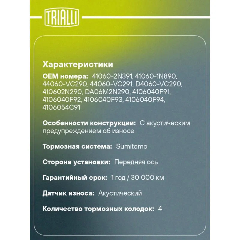 Колодки тормозные дисковые для автомобилей Nissan Patrol (97-) задние Характеристики: Артикул: PF 4303 OEM номера: 410602N290, 410602N390, 410602N392, 4106034Y90, 410603N390, 4106040F90, 4106040F91, 4106040F92, 4106040F93, 4106040F94, 4106054C91, 4106057C90, 4106057C91, 4106062Y90, 4106075F90, 44060VB190, 44060VB191, 44060VB290, 44060VC090, AY040NS010, AY040NS030, AY040NS836, AY040NS910, AY040NS911, D10602N290, D10602N390, D10603N390, D106040F90, D106040F91, D106M2N290, D106M40F25, D106M40F94, D106M40F94VW, D106MN2288, D4060VC090, D4060VS21A, 410602N392, 4106034Y90, 410603N390, 4106040F90, DA06M2N290, DA06M40F25, DA06M-2N290, 44060-VC290, 44060-VC291, D4060-VC290, 410602N290, 410602N390, 4106040F93, 4106057C90, 4106062Y90, 44060VB190, 41060-2N391, 41060-1N890 Количество на автомобиль: 1 Сторона установки: Передняя ось Особенности конструкции:: С акустическим предупреждением об износе WVA: 23502, 23503, 23504 Тормозная система: Sumitomo Гарантийный срок: 1 год / 30 000 км Датчик износа: Акустический Количество тормозных колодок: 4 Сопутствующий товар: Диски тормозные: DF 140123 Ширина, мм: 121 Высота, мм: 50 Толщина, мм: 16 Материал фрикционной накладки: Low-Metallic Подходит для авто: Nissan Patrol Y61 (97-) Для проверки применяемости отправьте VIN автомобиля через вкладку "Есть вопросы о товаре?" Комплектация: Колодка тормозная - 4 шт Гарантия: от 1 года.