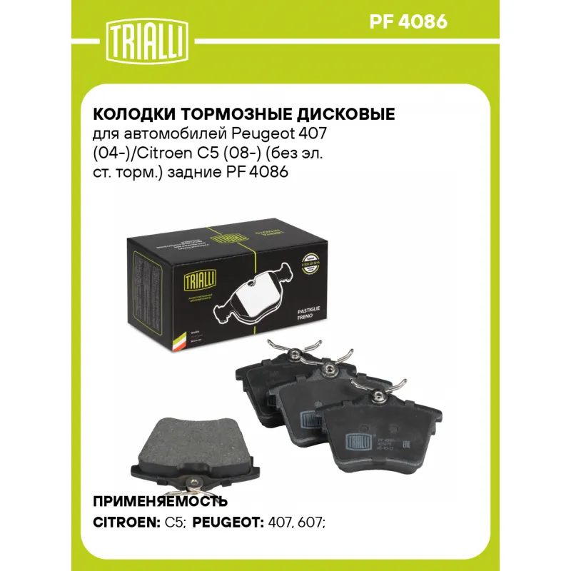 Колодки тормозные дисковые для автомобилей Peugeot 407 (04-)/Citroen C5 (08-) (без эл. ст. торм.) задние Характеристики: Артикул: PF 4086 OEM номера: 425279, 425326, 425404, 425421, 425491 Количество на автомобиль: 1 Сторона установки: Задняя ось Особенности конструкции:: Не подготовлены для датчика износа Тормозная система: TRW Гарантийный срок: 1 год / 30 000 км Датчик износа: Не предусмотрен Количество тормозных колодок: 4 Сопутствующий товар: Диски тормозные: DF 051317 Ширина, мм: 85,9 Высота, мм: 56,7 Толщина, мм: 17 Материал фрикционной накладки: Low-Metallic Комплектация: Колодка тормозная - 4 шт Гарантия: от 1 года.