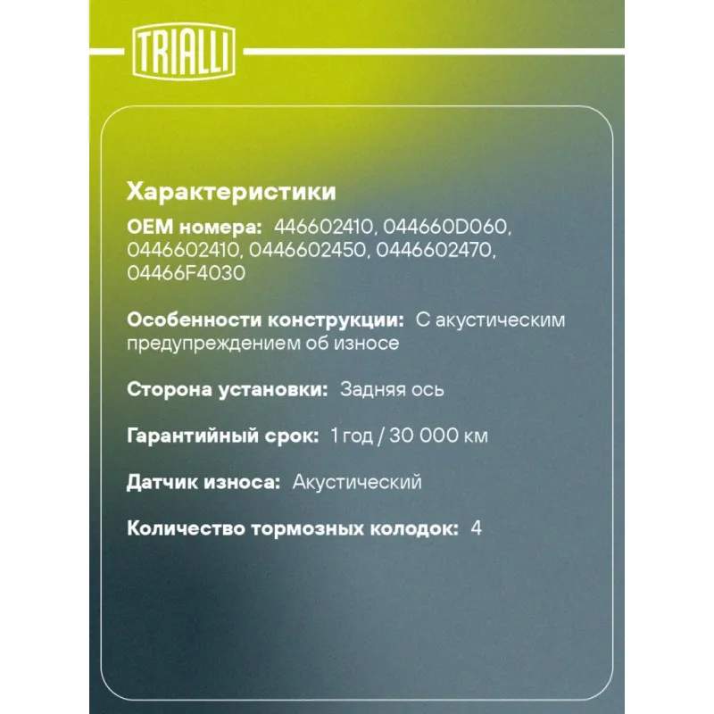 Колодки тормозные дисковые задние для автомобилей Toyota Corolla (19-) с тормозной системой CBI 100x50мм Характеристики: Артикул: PF 2467 OEM номера: 446602410, 044660D060, 0446602410, 0446602450, 0446602470, 04466F4030 Особенности конструкции:: С акустическим предупреждением об износе Гарантийный срок: 1 год / 30 000 км Количество на автомобиль: 1 Сторона установки: Задняя ось WVA: 26237, 26236 Датчик износа: Акустический Количество тормозных колодок: 4 Ширина, мм: 99,4 Высота, мм: 49,7 Толщина, мм: 15,3 Комплектация: Колодка тормозная - 4 шт Скоба установочная - 8 шт Гарантия: от 1 года.