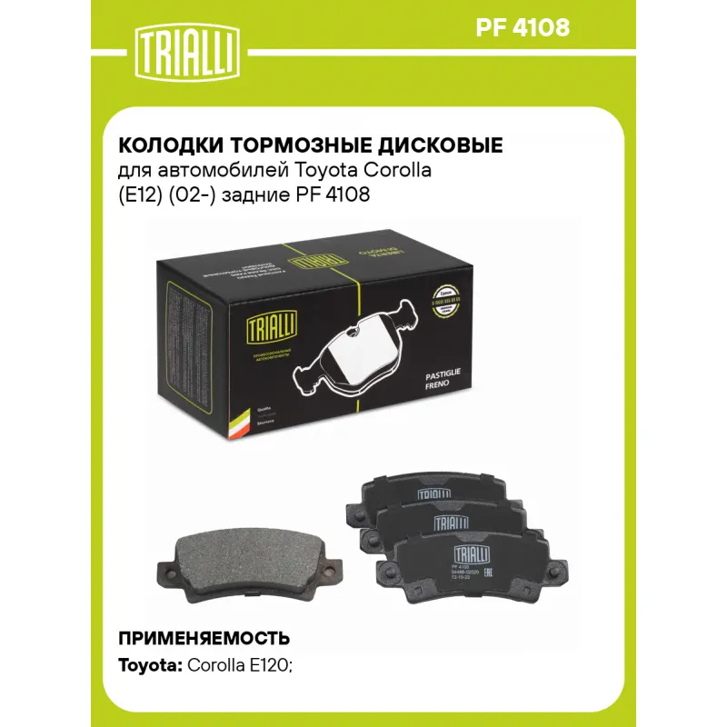 Колодки тормозные дисковые для автомобилей Toyota Corolla (E12) (02-) задние Характеристики: Артикул: PF 4108 OEM номера: 0446602020, 0446602040, 0446602070, 0446602110, 0446602160, 04466YZZD9 Количество на автомобиль: 1 Сторона установки: Задняя ось Особенности конструкции:: С акустическим предупреждением об износе WVA: 23816 Тормозная система: TRW Гарантийный срок: 1 год / 30 000 км Датчик износа: Акустический Количество тормозных колодок: 4 Сопутствующий товар: Диски тормозные: DF 190221 Ширина, мм: 95,5 Высота, мм: 37,8 Толщина, мм: 15,8 Сопутствующий товар: Шланги тормозные: BF 4650 Подходит для авто: Toyota Corolla E120 (01-), Corolla E120 (01-) Для проверки применяемости отправьте VIN автомобиля через вкладку "Есть вопросы о товаре?" Комплектация: Колодка тормозная - 4 шт Гарантия: от 1 года.