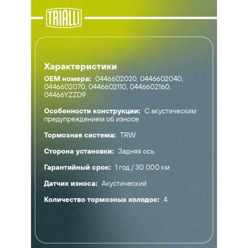 | Особенности конструкции: | С акустическим предупреждением об износе |