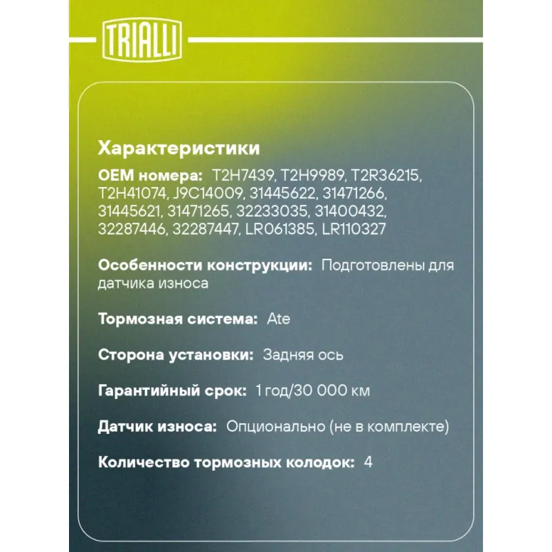 | Особенности конструкции: | Подготовлены для датчика износа |