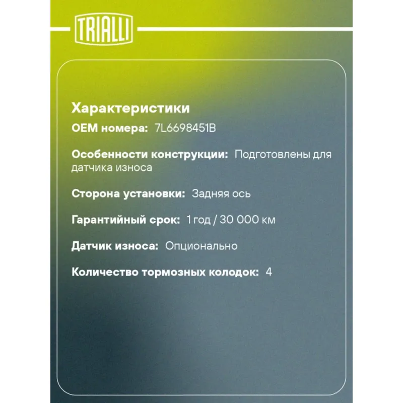 | Особенности конструкции: | Подготовлены для датчика износа |