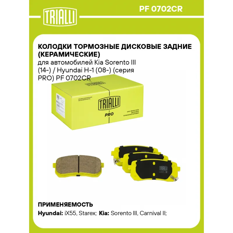 Колодки тормозные дисковые задние (керамические) для автомобилей Kia Sorento III (14-) / Hyundai H-1 (08-) (серия PRO) Характеристики: Артикул: PF 0702CR OEM номера: 58302-3JA50, 58302-4HA50, 583023JA00, 583023JA51, 58302-C5A70, S58302C5A70, 583024DA00, 583024DE00, 583024HA00, 58302A9A00, 58302A9A10, 58302C5A00, 58302C5A01, S58302C5A00, 3301131XKW09A Особенности конструкции:: С акустическим предупреждением об износе Гарантийный срок: 1 год / 30 000 км Количество на автомобиль: 1 Сторона установки: задняя ось WVA: 24599, 24600, 24686 Тормозная система: Mando Датчик износа: Акустический Количество тормозных колодок: 4 Сопутствующий товар: Диски тормозные: DF 084211; DF 084212; DF 084509 Ширина, мм: 110,5 Высота, мм: 47,8 Толщина, мм: 15 Материал фрикционной накладки: Low-Metallic Подходит для авто: Hyundai iX55 (09-), Starex (H-1) (07-) Kia Sorento III (14-), Carnival II (06-) Для проверки применяемости отправьте VIN автомобиля через вкладку "Есть вопросы о товаре?" Комплектация: Колодка тормозная - 4 шт Гарантия: от 1 года.