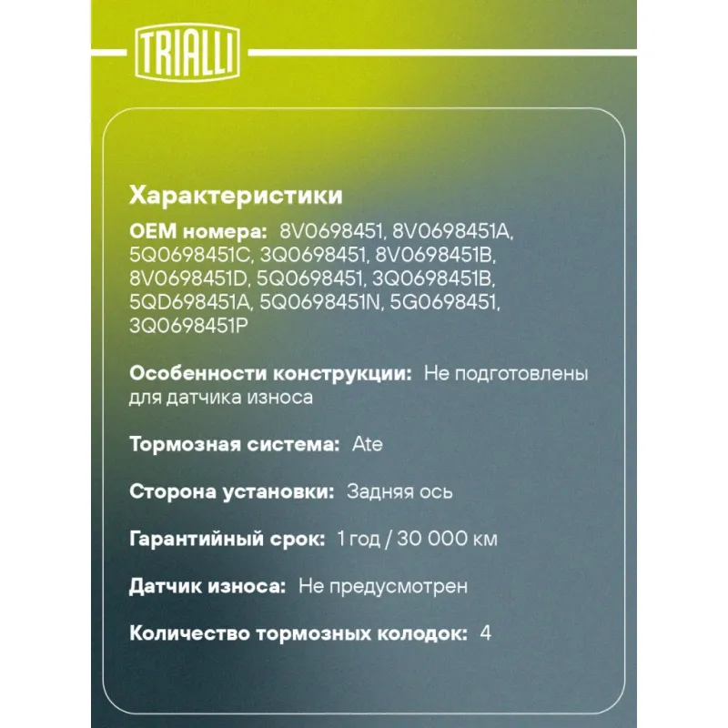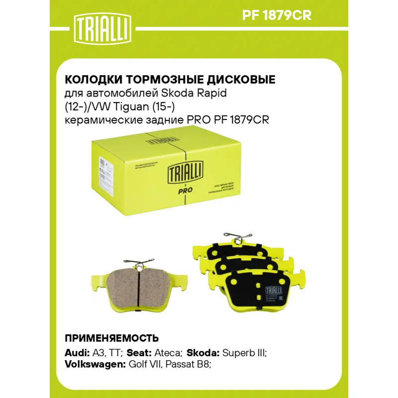 Колодки тормозные дисковые для автомобилей Skoda Rapid (12-)/VW Tiguan (15-) керамические задние PRO Характеристики: Артикул: PF 1879CR OEM номера: 8V0698451, 8V0698451A, 5Q0698451C, 3Q0698451, 8V0698451B, 8V0698451D, 5Q0698451, 3Q0698451B, 5QD698451A, 5Q0698451N, 5G0698451, 3Q0698451P, 5Q0698451AC, 5Q0698451AG, 5Q0698451AH, 3Q0698451C, 3Q0698451D, 3Q0698451E, 3Q0698451F, 3Q0698451G, 3Q0698451J, 3Q0698451K, 3Q0698451N, L5QD698451A Особенности конструкции:: Не подготовлены для датчика износа Гарантийный срок: 1 год / 30 000 км Количество на автомобиль: 1 Сторона установки: задняя ось Тормозная система: Ate Датчик износа: Не предусмотрен Количество тормозных колодок: 4 Сопутствующий товар: Диски тормозные: DF 180108; DF 180114; DF 180121; DF 180128; DF 180130 Ширина, мм: 123 Высота 1, мм: 56,2 Высота 2, мм: 61,2 Толщина, мм: 16,2 Материал фрикционной накладки: Ceramic Товарная линейка: PRO Подходит для авто: Audi A3 (12-), TT (14-) Seat Ateca (16-) Skoda Superb III (15-) Volkswagen Golf VII (12-), Passat B8 (15-), Tiguan (16-), Touran III (15-) Для проверки применяемости отправьте VIN автомобиля через вкладку "Есть вопросы о товаре?" Комплектация: Колодка тормозная - 4 шт Гарантия: от 1 года.
