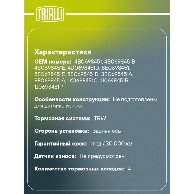 Колодки тормозные дисковые для автомобилей VW Polo Sedan (RUS) (10-) керамические задние PRO Характеристики: Артикул: PF 1877CR OEM номера: 4B0698451, 4B0698451B, 4B0698451E, 4D0698451D, 8E0698451, 8E0698451E, 8E0698451D, 3B0698451A, 8E0698451A, 1K0698451C, 1J0698451R, 1J0698451P, 1J0698451N, 1J0698451L, 1J0698451K, 1J0698451H, 1J0698451, 8E0698451K, 3B0698451, 1J0698451F, 1K0698451J, 6X0698451A, 1J0698451J, 4D0698451E, 1J0698451B, 1J0698451D, 1J0698451E, 1JD698451, 4B0698451A, 8D0615405S, 8D0615406S, 1J0698451M, 425241, 425428, 425396, 425467, 425223, 4254C1, 1608520380, 1608681580, E172204, 1205557, 1027640, YM212M008CA, 1115107, 7354162, 7701206784, 7701207695, 7701208421, 7701208416, 7701208213, 6025371650, 7701206343, 7701207484, 440600295R, 7701209841, 440603530R, 7701209735, 440607960R, 440600364R, 440605713R, 410606678R, 440602466R, 8671016582, 440603511R, 440605839R, 440661332R, 6X0698451, 1H0698451D, 1J0698451S, JZW698451C, 5Q0698451A, JZW698451A, 1K0698451M, JZW698451, 3B0698451E, 5C0698451A, 5C0698451, JZW698451B, 6R0698451, 5Q0698451E, 5C0698451B, SHZ3501023, 3420001, 1JD698451A, 5QD698451, 10030811, 1001096, 95WX2M008BA, 9404252328, 8EA698451, 8D0698451, 7M0698451, 4D0698451C, 1K0698451A, 1J0698451G, 1J0698451C, 1H0698451A, 1H0698451, 1H0615415D, 1H0615415A, 1H0615415, 1E0698451G, 1E0698451E, 1E0698451D, 1E0698451C, 1E0698451B, 1E0698451, 5K0698451E, 5Q0698451M, 5Q0698451AA, 5K0698451B Особенности конструкции:: Не подготовлены для датчика износа Гарантийный срок: 1 год / 30 000 км Количество на автомобиль: 1 Сторона установки: задняя ось WVA: 20961 Тормозная система: TRW Датчик износа: Не предусмотрен Количество тормозных колодок: 4 Сопутствующий товар: Диски тормозные: DF 180104; DF 180105; DF 180106; DF 180107; DF 180108; DF 180112; DF 180114; DF 180121; DF 180122; DF 180127; DF 180128; DF 180129; DF 180131; DF 1801s; DF 1802s; DF 185106 Ширина, мм: 87 Высота, мм: 53 Толщина, мм: 17 Материал фрикционной накладки: Ceramic Товарная линейка: PRO Сопутствующий товар: Шланги тормозные: BF 1801; BF 1802; BF 4805; BF 4811 Сопутствующий товар: Суппорты тормозные: CF 182001; CF 182002; CF 182003; CF 182004; CF 182007; CF 182008; CF 182009; CF 182010; CF 182011; CF 182012; CF 182063; CF 182064; CF 182065; CF 182066; CF 182067; CF 182068; CF 182069; CF 182070; CF 550112 Подходит для авто: Audi A1 (10-), A3 (96-), A3 (03-), A3 (07-), A4 B5 (94-), A4 (97-), A4 B6 (00-), A4 B7 (04-), A4 B7 (04-), A4 B8 (07-), A6 C4 (94-), A6 C5 (97-), A6 C6 (04-), A8 (94-), A1 (10-), A3 (96-), A3 (03-), TT (98-) Citroen Berlingo (00-), Berlingo II (08-), C2 (03-), C3 (02-), C4 (04-), C4 (04-), C4 (10-), C4 (10-), C4 Picasso (06-), C4 Picasso (06-), DS4 (11-), Xsara II (00-), C4 Aircross (12-), DS4 (11-) Ford Galaxy I (95-) Peugeot 307 (00-), 1007 (05-), 308 (07-), 308 (07-), 308 (13-), Partner (96-), 308 (13-), Partner (08-) Renault Clio IV (12-), Fluence (10-), Scenic II (04-), Scenic III (09-), Megane II (02-), Megane III (08-), Clio III (05-), Clio III (05-), Clio III (05-), Megane II (02-), Megane III (08-), Modus (02-) Skoda Fabia I (99-), Rapid (12-), Roomster (06-), Superb I (01-), Yeti (09-), Octavia A7 (13-), Fabia I (99-), Fabia II (07-), Octavia (96-), Rapid (12-), Roomster (06-), Yeti (09-) Volkswagen Bora (99-), Passat B5 (96-), Polo IV (01-), Polo Sedan (RUS) (10-), Beetle (10-), Caddy (04-), Eos (06-), Golf III (91-), Golf IV (97-), Golf Plus (05-), Golf Plus (09-), Golf VI (08-), Jetta (11-), Lupo (98-), Beetle (98-), Passat B6 (05-), Passat B6 (05-), Scirocco (08-), Vento (92-), Bora (99-), Golf V (03-), Polo IV (01-), Polo Sedan (RUS) (10-), Polo V (09-), Caddy (04-), Eos (06-), Golf IV (97-), Golf VI (08-), Golf VII (12-), Passat B6 (05-) Seat Altea (04-), Altea (07-), Cordoba (00-), Cordoba (00-), Ibiza (93-), Ibiza (00-), Ibiza (00-), Ibiza (08-), Leon (99-), Leon (05-), Leon (05-), Toledo (98-), Toledo (04-), Toledo (12-) Для проверки применяемости отправьте VIN автомобиля через вкладку "Есть вопросы о товаре?" Комплектация: Колодка тормозная - 4 шт Гарантия: от 1 года.
